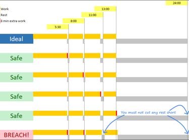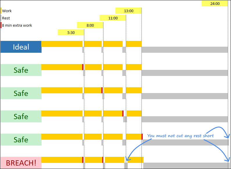 periods of work and rest in the 24 hours and less periods are calculated in a cumulative way, so the 8-min tolerance follows the same cumulative way. Ideally, the driver must not accumulate 8 minutes of extra work in every period because this will lead to a breach being recorded. This is best explained in the below illustration where the ideal situation and the 8-minute extra work situation could be compared: (tap on picture to view it in full screen - downloadable version at the bottom )