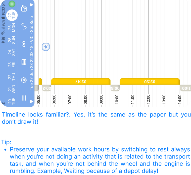 The day starts when the driver switches to work after taking the min 7 hours rest. Time Spent = 10 Seconds